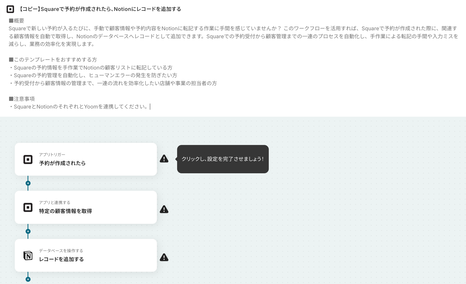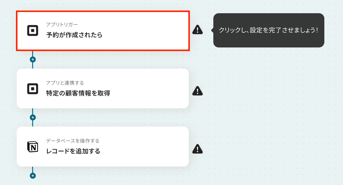 それではここから代表的な例として、「Squareで新しい予約が作成された際に、その詳細情報をNotionデータベースにレコードとして自動で追加する」フローの設定手順を解説していきます!