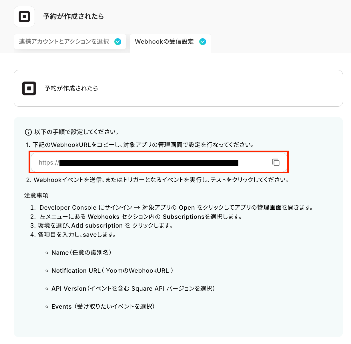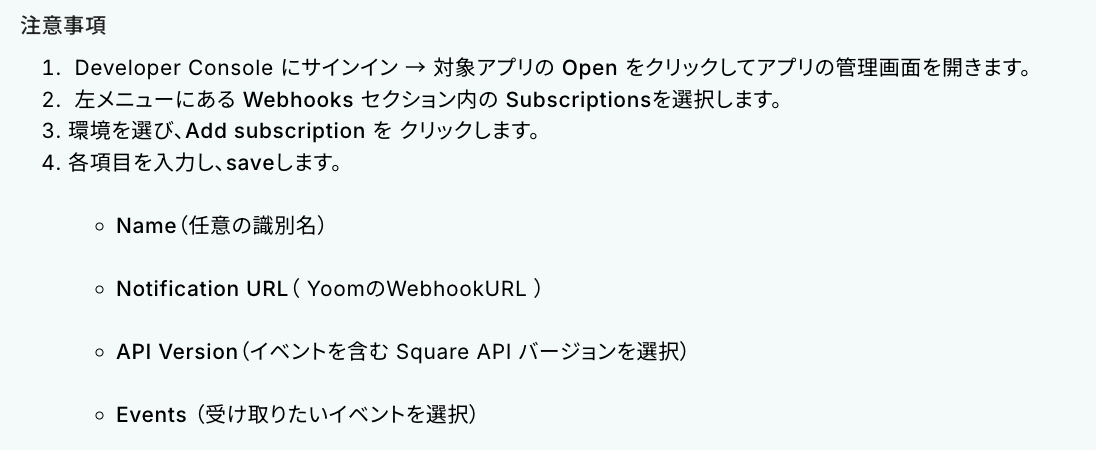 Squareの画面に移動したら下図の注意事項に記載されている手順に従い、Webhookの受信設定を行ってください。