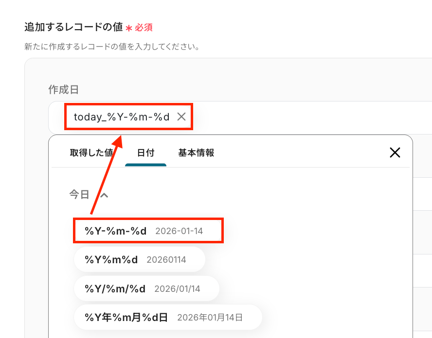 今回のNotionの「レコードを追加する」アクション部分を、使用したいアプリのアクションに変更してご利用ください。