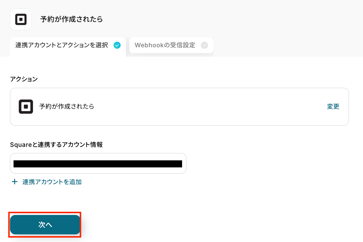 次に、フローと連携するSquareアカウントと、起動対象として検知したいアクションを選択していきます。