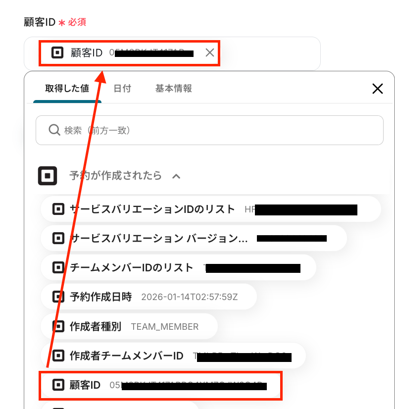 - 次に、オペレーションでSquareの「特定の顧客情報を取得」アクションを設定し、予約情報に紐づく顧客データを取得します。