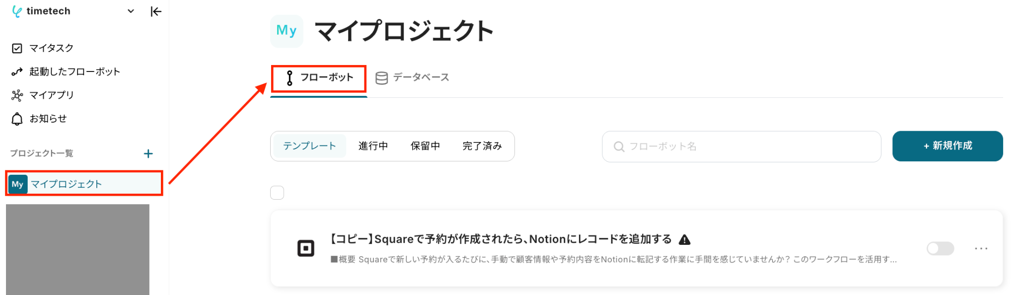 Yoomの画面左側にあるメニュー欄から「マイプロジェクト」にアクセスし、「フローボット」を選択すると、「【コピー】Squareで予約が作成されたら、Notionにレコードを追加する」という名前で格納されているはずです。