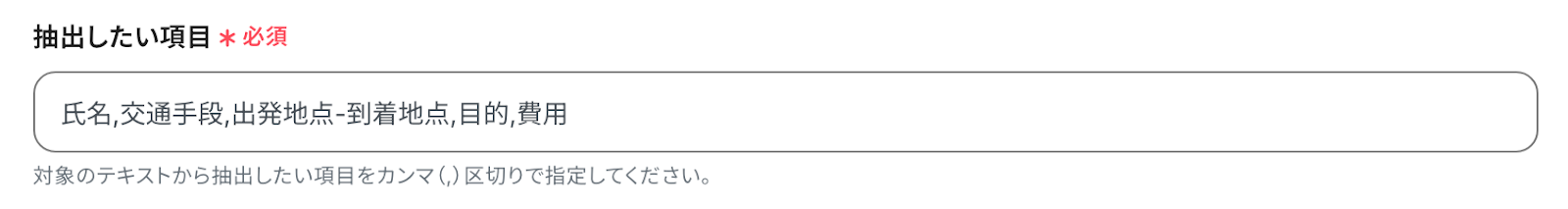 ここでは、対象のテキストから抽出したい項目をカンマ(,)で区切り、指定します。