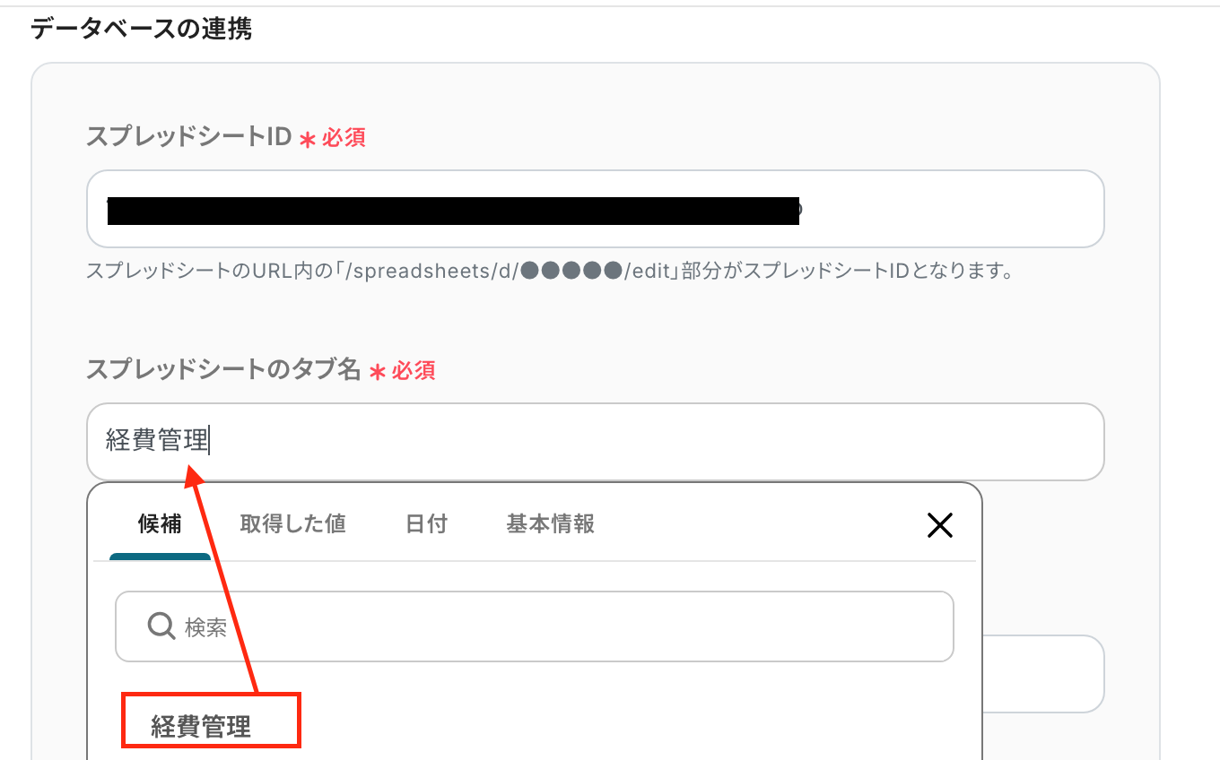 スプレッドシートIDやタブ名はボックスをクリックすることでも選択可能です。