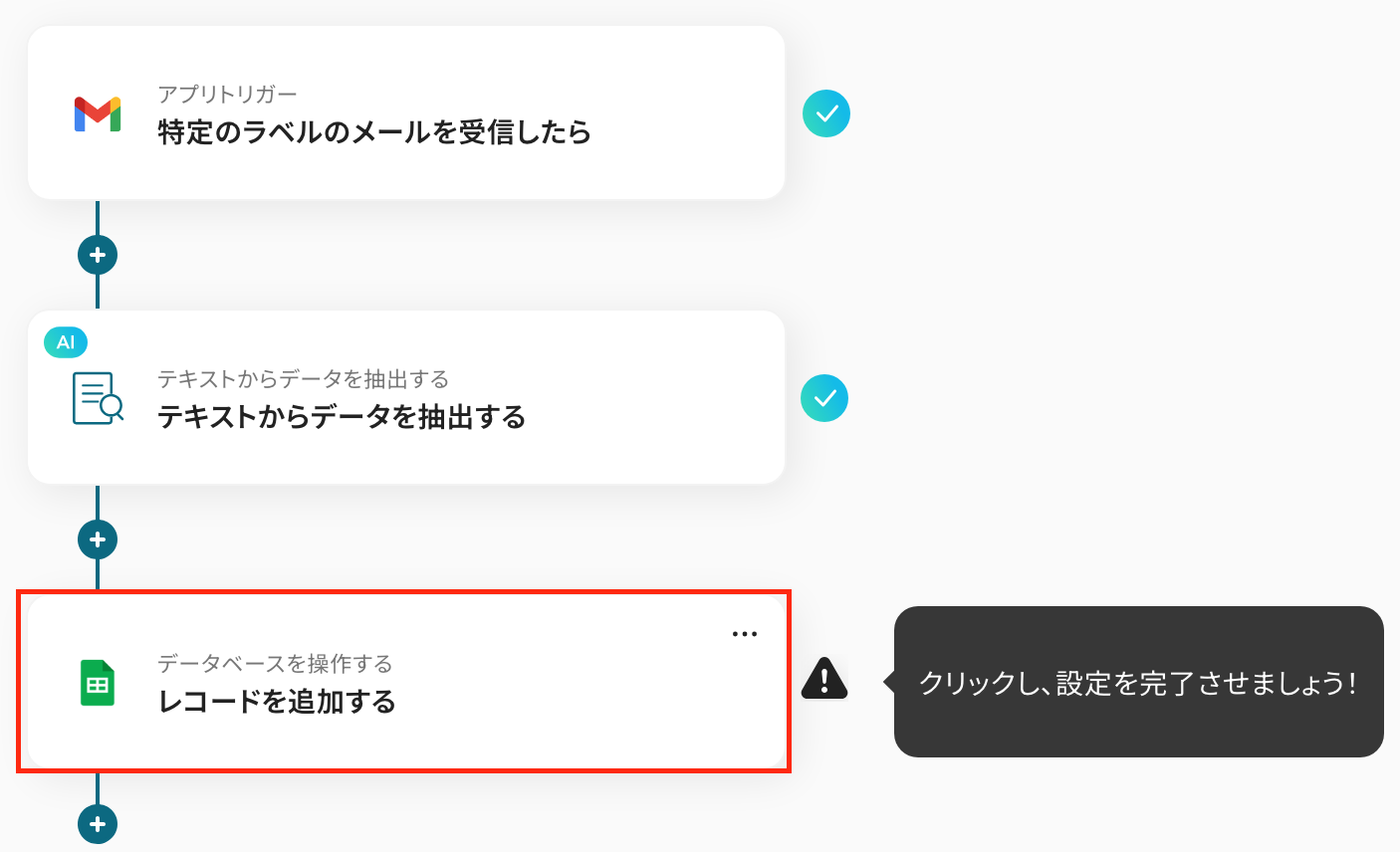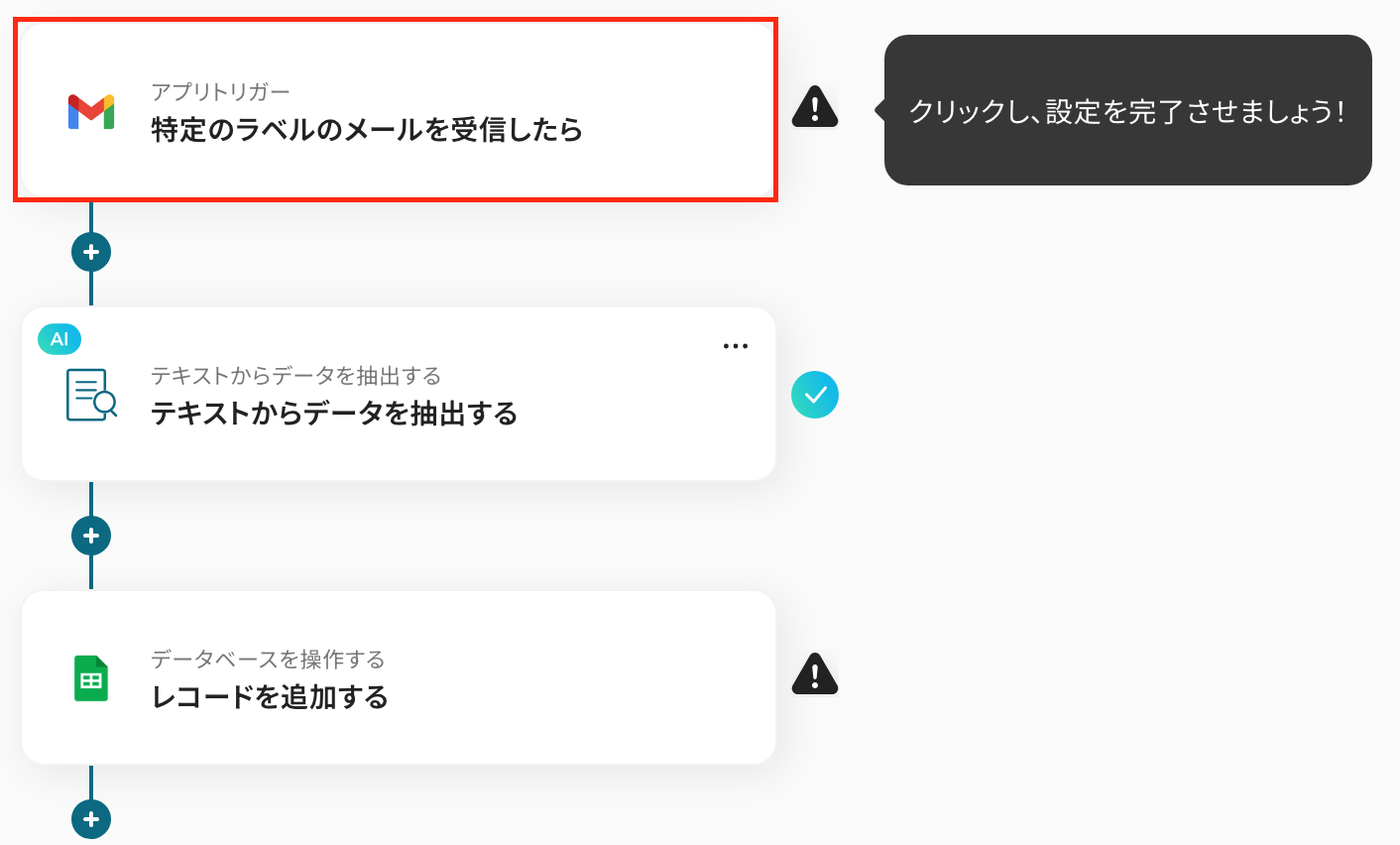 - Gmailのトリガー設定・AIのアクション設定・Google スプレッドシートのアクション設定