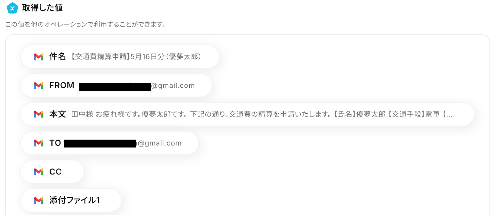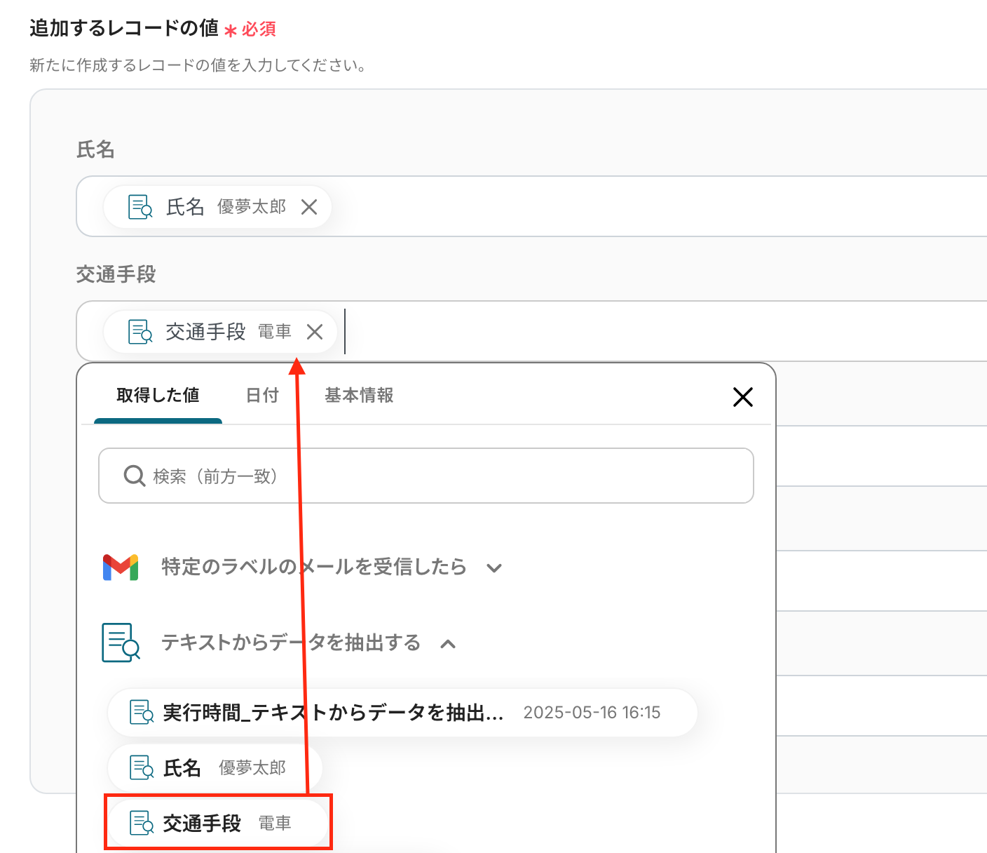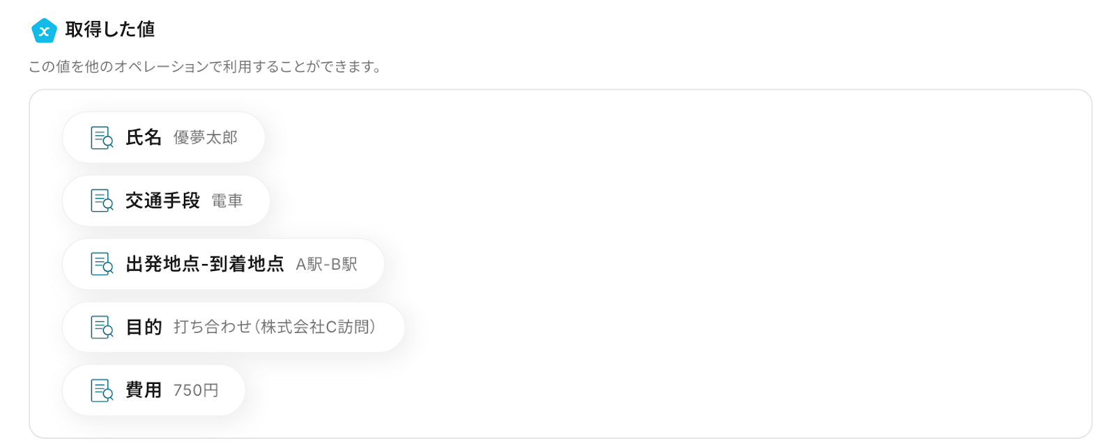 以下は例として、「交通手段」の項目に前ステップで取得した【交通手段】の情報を引用したものです。
