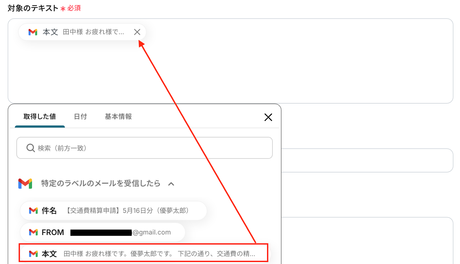 ボックスをクリックして表示される「取得した値」から設定が可能です。