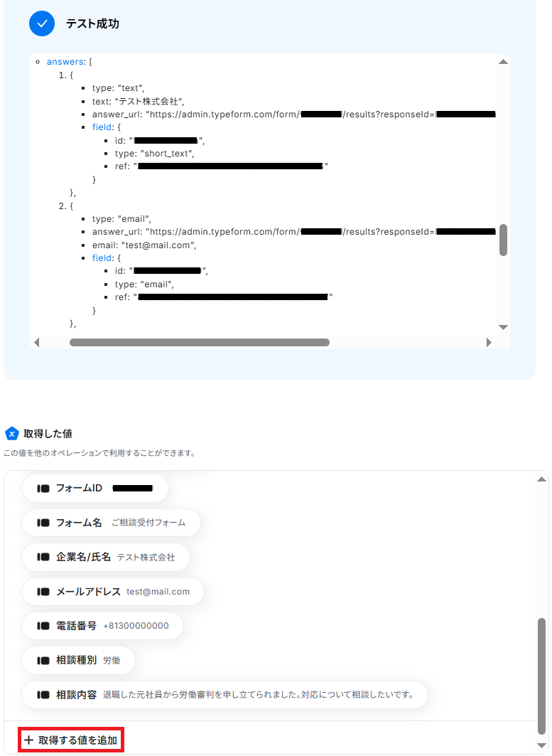 - Typeformの回答内容を取得する方法は「『取得する値』を追加する方法」をご参照ください。