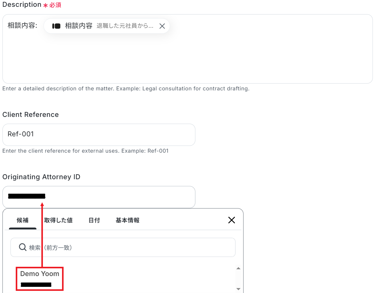 - Clio Manageへの登録項目には、AI機能で抽出した情報だけでなく、固定のテキストなどを任意の項目に設定することが可能です。