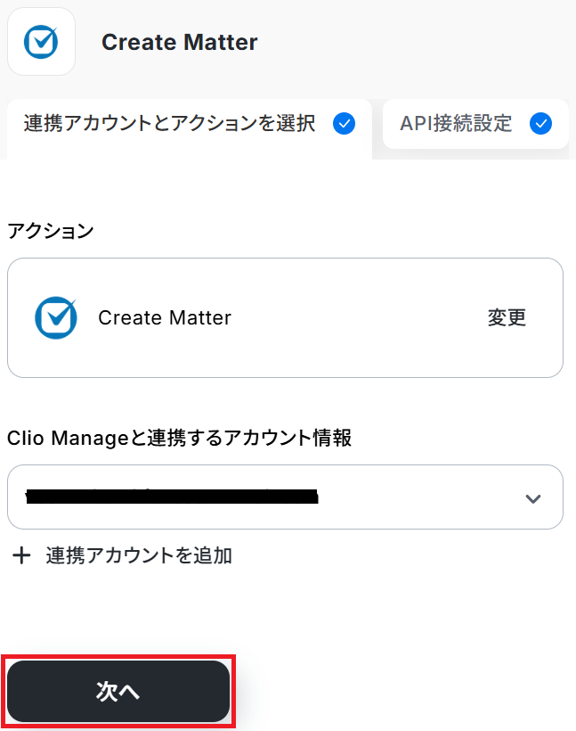 ステップ3・4と同様、アクションは「Create Matter」のまま「次へ」をクリックします。