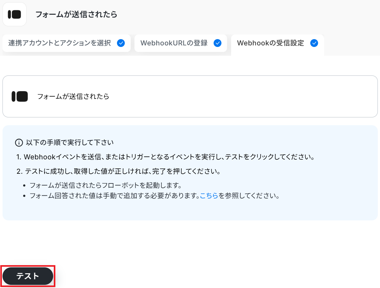 最後に、Yoomの設定画面に戻りテストします。