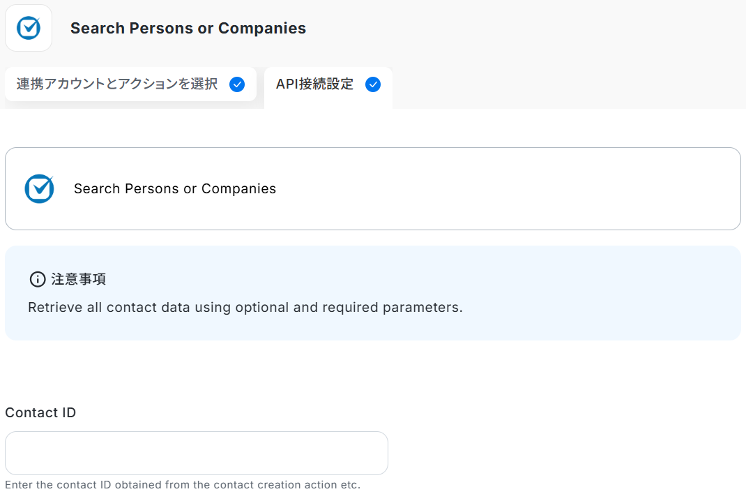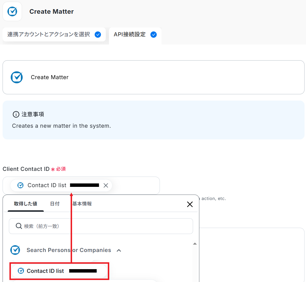 先ほど取得した回答内容をもとに、Matter作成に必要なContact IDを検索します。