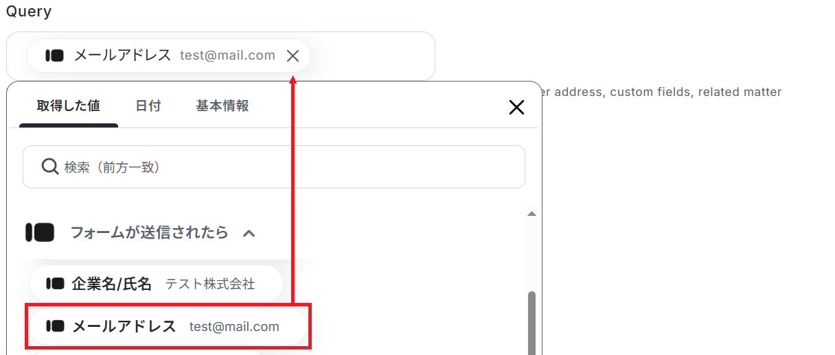 最後に、Queryの欄にTypeformから取得した「メールアドレス」の値を設定しテストしてください。
