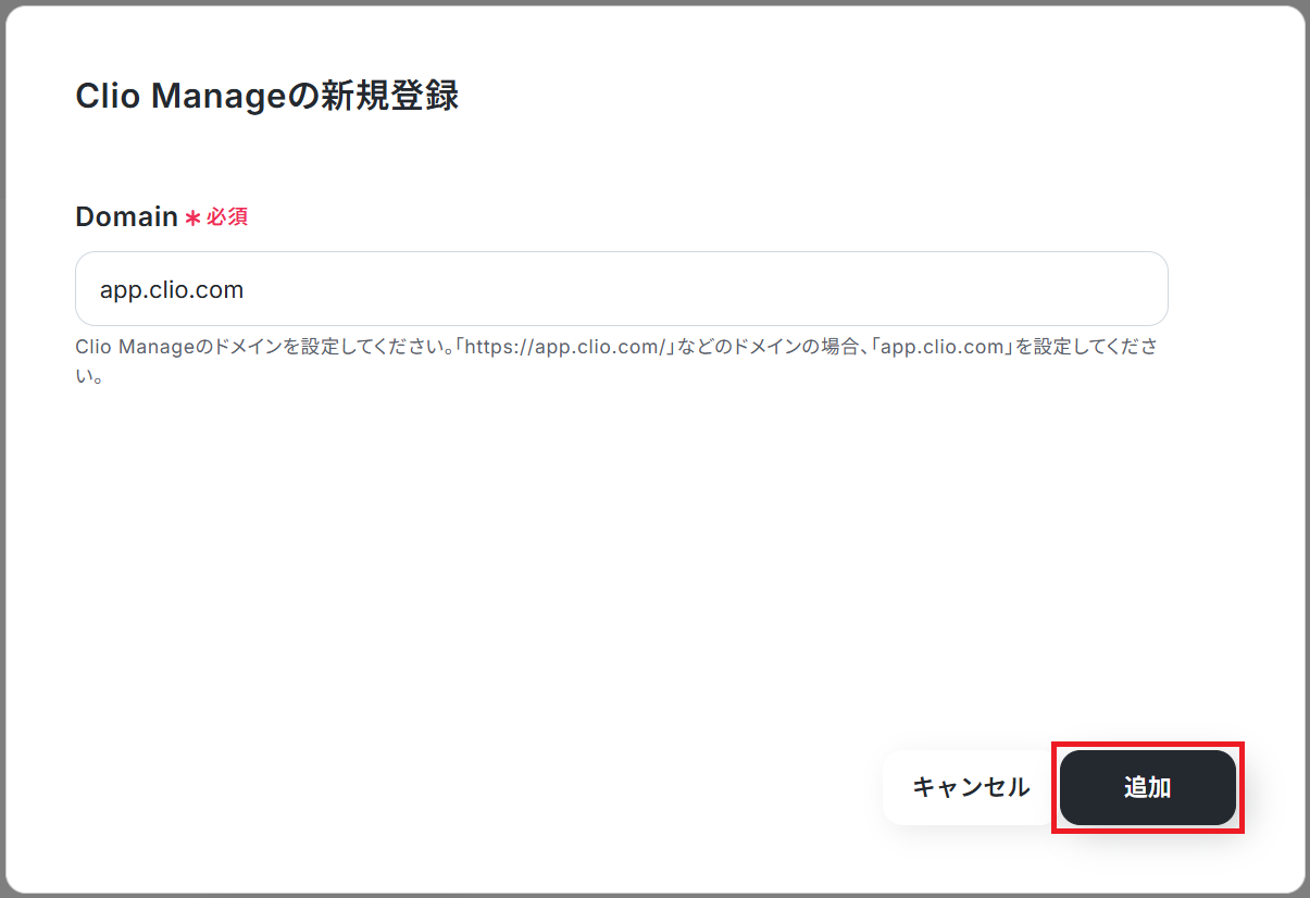 Clio ManageのURLから確認できるDomainを入力し「追加」をクリックしてください。