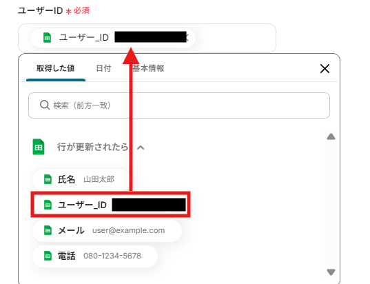 ユーザーID、名前、サブメールアドレス、電話番号などは以下のように取得した値から入力しています。 ここではすでに設定されていますが、「←トリガーで取得した値を設定してください」は削除してください。