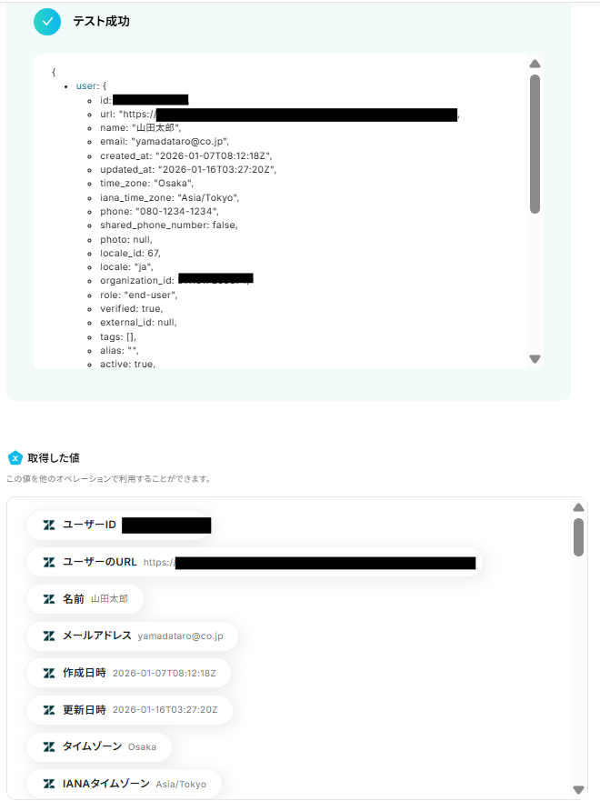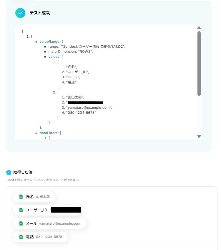 テストに成功すると、「取得した値 」に情報が追加されます。 なお、この「取得した値」は後続のフローで変動値として使用できます。
