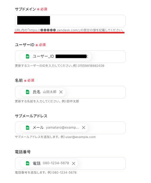 Zendeskでユーザーを作成するアクションを設定する際には、対象となるアカウントのサブドメインを任意で設定してください ■注意事項