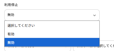 また、利用停止の項目は有効または無効を選択してください。 ※必須項目になっていませんが、選択していないとエラーとなる場合があります。