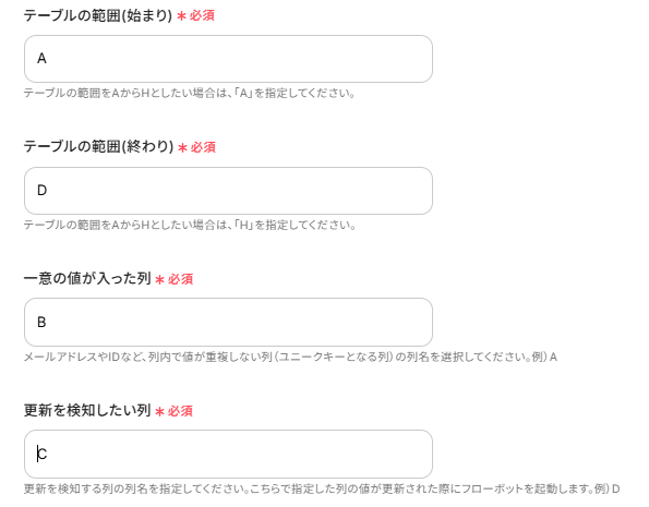 Google スプレッドシートのトリガー設定において、更新を検知する対象のスプレッドシートファイルとシート、列は任意で設定可能です。 ■注意事項