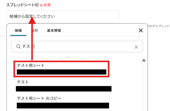 スプレッドシートIDとスプレッドシートのタブ名はボックスをクリックすると連携済みのIDが表示されるので準備しておいたスプレッドシートを候補から選択してください。