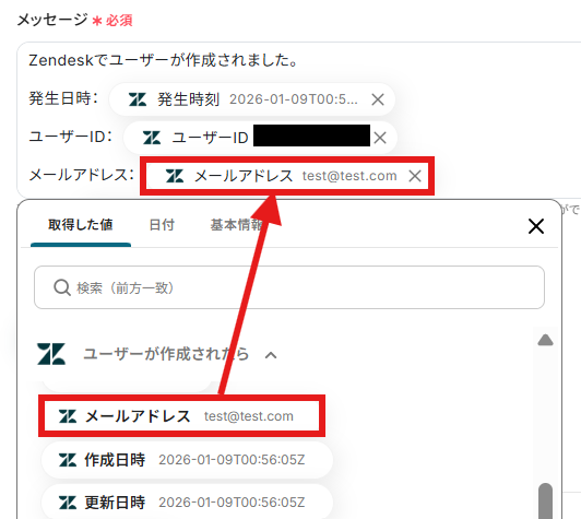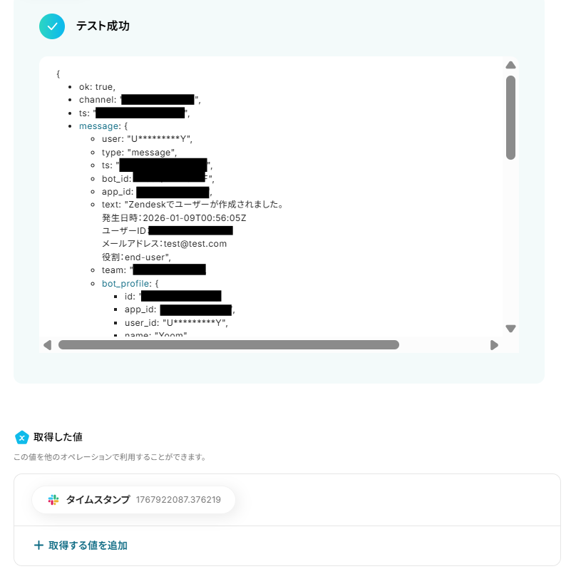 - Slackのオペレーションでは、通知を送りたいチャンネルIDを任意で設定します。メッセージ内容は、Zendeskから取得したユーザー情報などを用いて自由に設定してください。