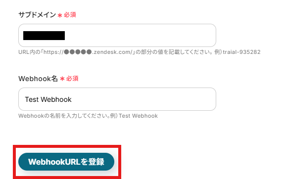 Webhookの登録を行います。画面の注釈通り「サブドメイン」と「Webhook名」を入力しましょう。