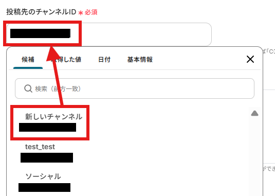 「投稿先のチャンネルID」は、候補から該当するチャンネルを選んでください。