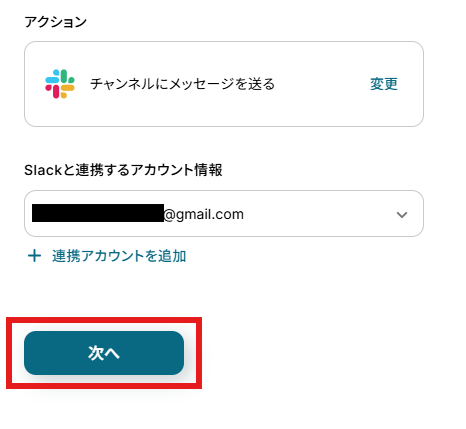 アクションはデフォルト設定のまま、アカウント情報は、連携したいアカウントが選択されているか確認してください。