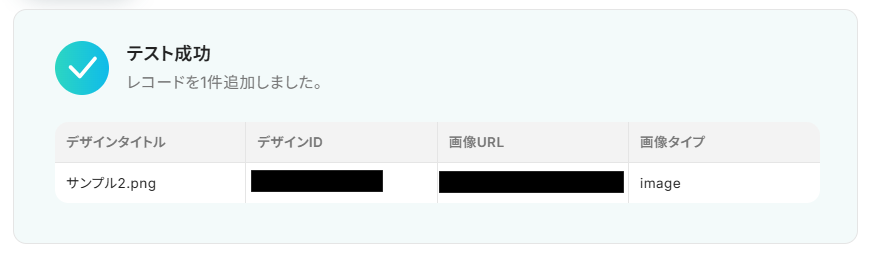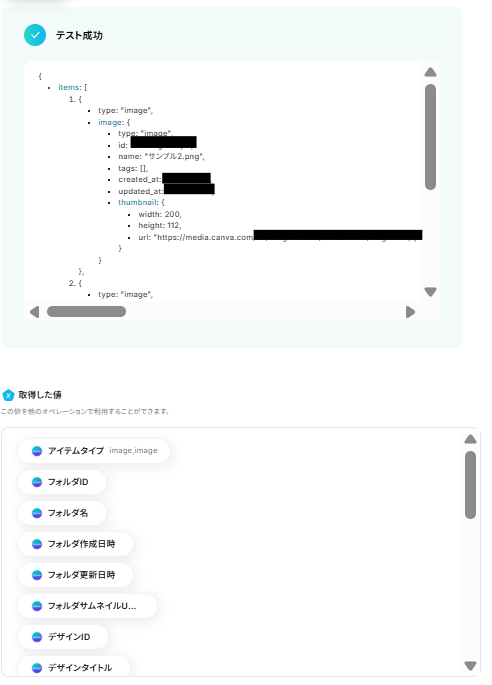 テストが成功すると取得した値の横に、連携したCanvaフォルダ内のアイテム情報が表示されます。 「完了」をクリックして、設定完了です!