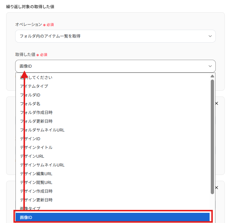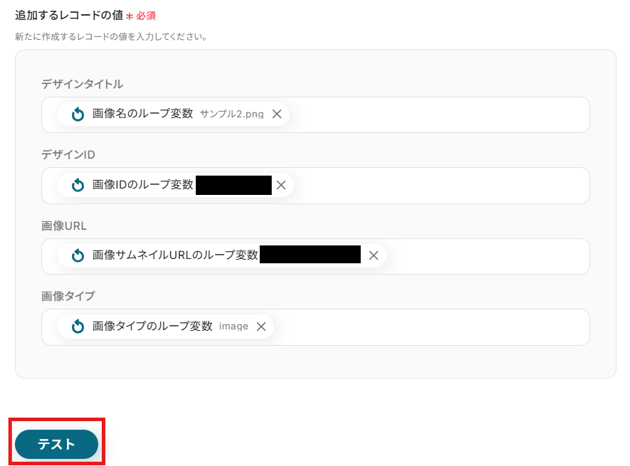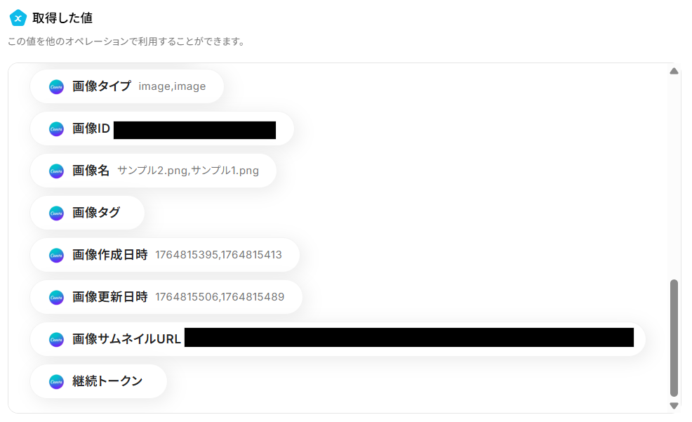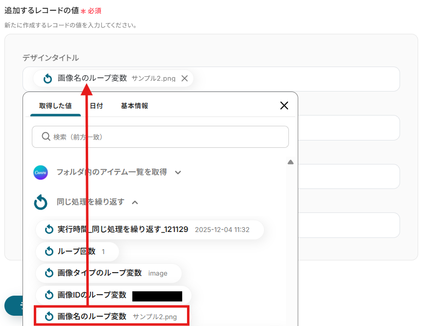 【補足】 繰り返し取得できる値は、ステップ4のテスト結果から確認できます。 値が入っている項目が指定できる項目です。 これらは、連携したフォルダに格納されているファイルの種類(デザインや画像)によって異なります。