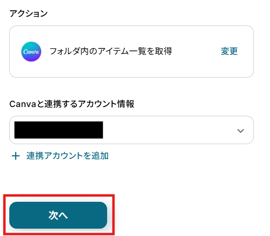 クリックすると以下の画面に移ります。 アカウント情報と書かれた項目にはステップ1でマイアプリ連携した際のアカウント情報が記載されています。 アクションは、「フォルダ内のアイテム一覧を取得」のままで次に進みましょう!