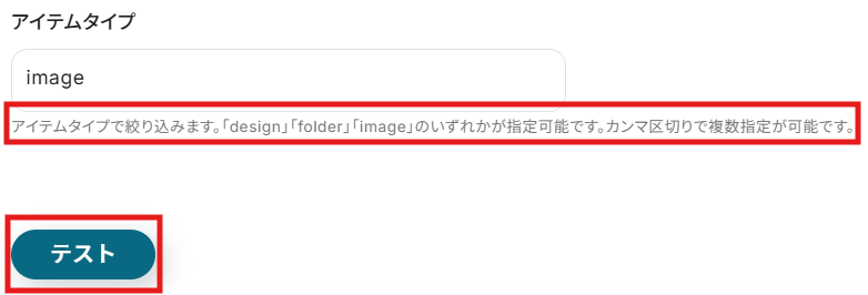 赤枠内の説明を参考に、アイテムタイプを任意で入力してください。 入力できたら、「テスト」をクリックします。