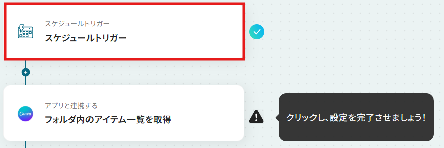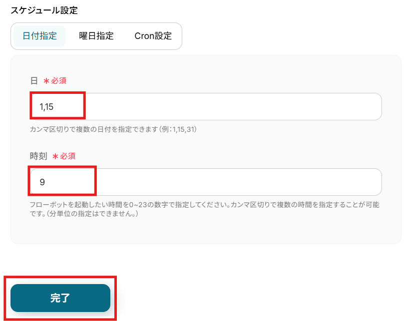 今回は、毎月1日と15日の朝9時にCanvaのフォルダ内にあるアイテム一覧を取得し、Google スプレッドシートに自動で追加する設定を例にしています。 下記画像を参考に、スケジュールを設定したら、「完了」をクリックしてください。