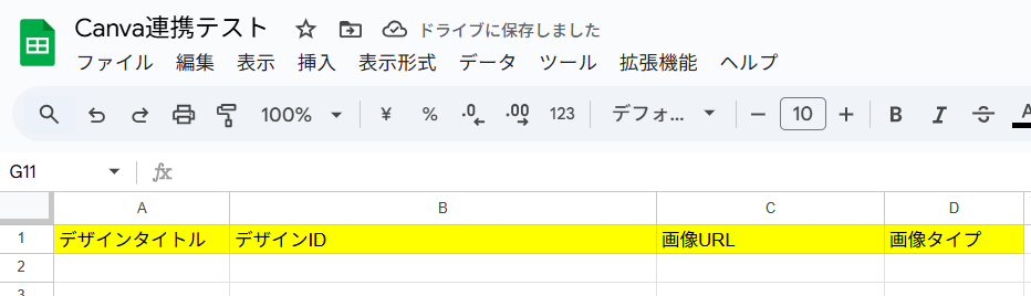 次に、Canvaと連携するGoogle スプレッドシートを選択します。 Canvaと連携するGoogle スプレッドシートをまだ作成していない場合は、ここで作成しましょう! Canvaのアイテム情報が反映されるよう、下記を参考にしてGoogle スプレッドシートを適切に設定してください。 ヘッダーの下に該当する情報が自動で追加されていくイメージです!※すでにCanvaと連携するGoogle スプレッドシートが作成済みの場合は、新たに作成する必要はありません。