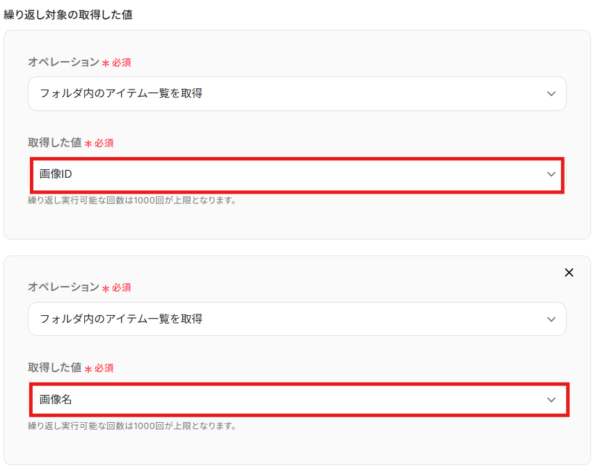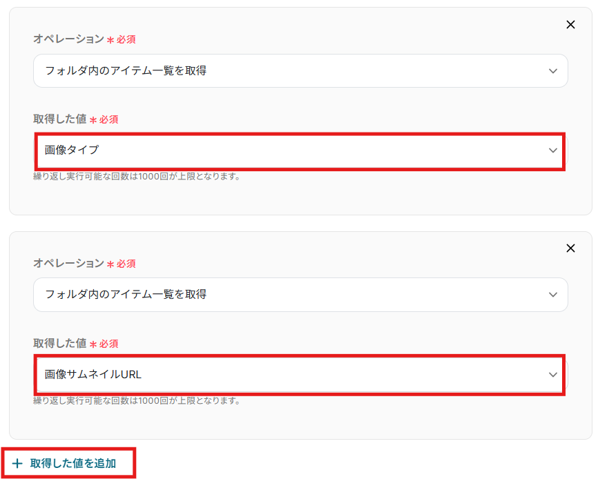 今回は連携したフォルダに画像を格納しているため、下記の内容で設定しました。 繰り返し取得する値を追加したい場合は、最下部の「+取得した値を追加する」をクリックすることで追加できます。 設定できたら、「完了」をクリックして設定完了です!