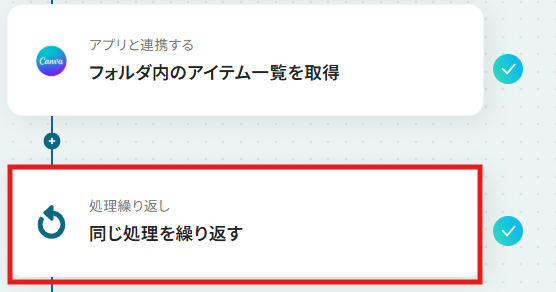 ステップ5:処理繰り返し設定 次に、Canvaフォルダのアイテム情報を繰り返し取得する設定を行います。 「同じ処理を繰り返す」をクリックしてください。
