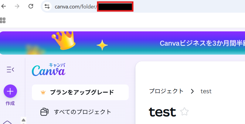 フォルダIDは、CanvaのURLから確認できます。 Canvaにログインして連携したいフォルダを開き、赤枠で囲まれている部分がフォルダIDです。 フォルダIDをコピーしましょう。