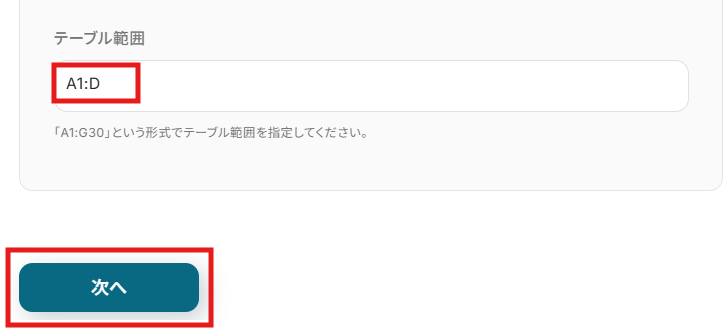 更新したい値が記載されているテーブル範囲を任意で入力し、「次へ」をクリックします。