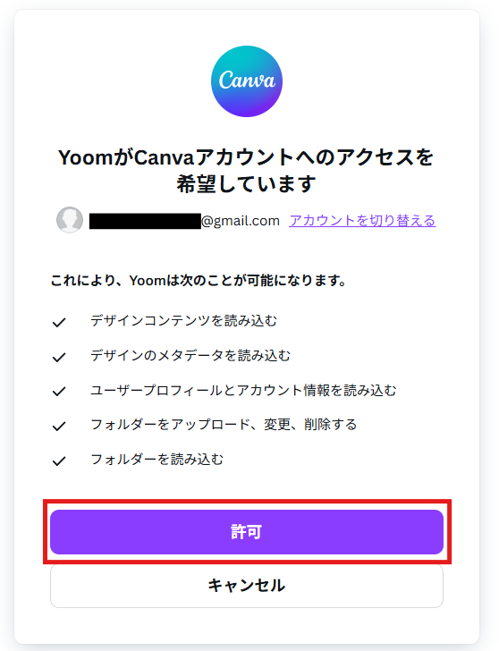 Canvaにログインすると下記の画面が表示されます。 内容を確認し、「許可」をクリックしてください。