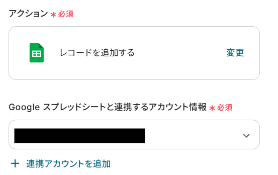 クリックすると以下の画面に移ります。 Canvaと同様に、ステップ1でマイアプリ連携したGoogle スプレッドシートのアカウント情報が自動で表示されます。 実行アクションは、「レコードを追加する」のままで次に進みましょう!