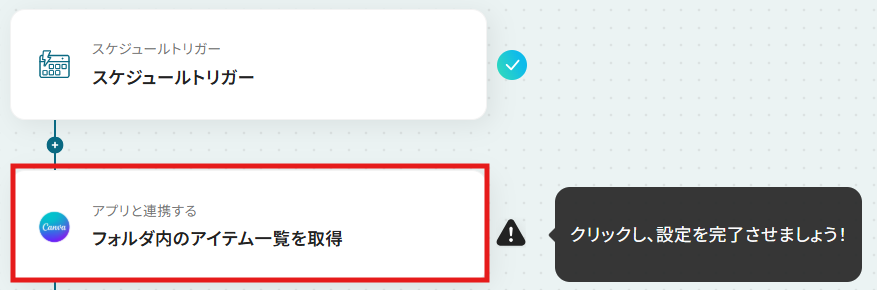 ステップ4:Canvaのアクション設定 次に、Canvaのフォルダ内のアイテム一覧を取得する設定を行います。 「フォルダ内のアイテム一覧を取得」をクリックしてください。