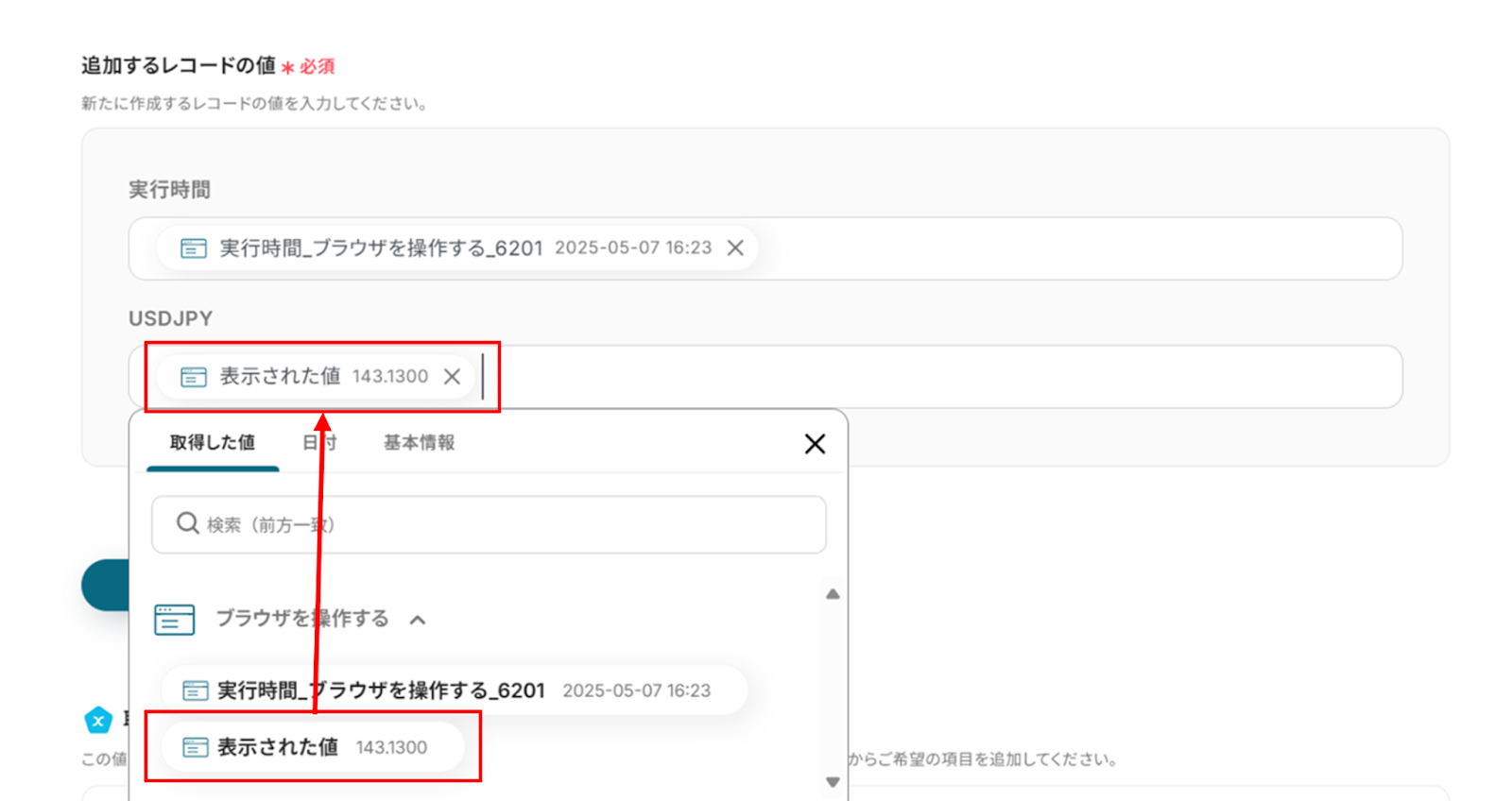 (4)「データベース操作の詳細設定」画面から、追加するレコードの値を「取得した値」から選択します。