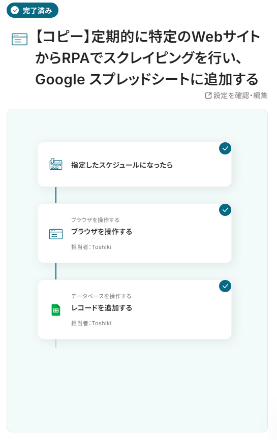 下記の通り、起動画面で「完了済み」となれば、フローボットは問題なく設定されています!