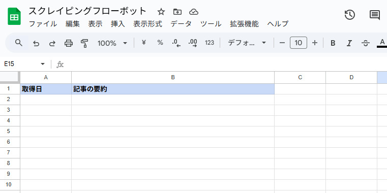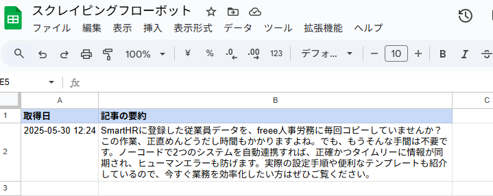 今回は下記のように簡単に、「(記事の)取得日」と「記事の要約文」を追加するGoogle スプレッドシートを作成しました。