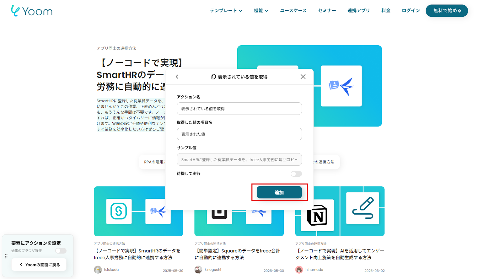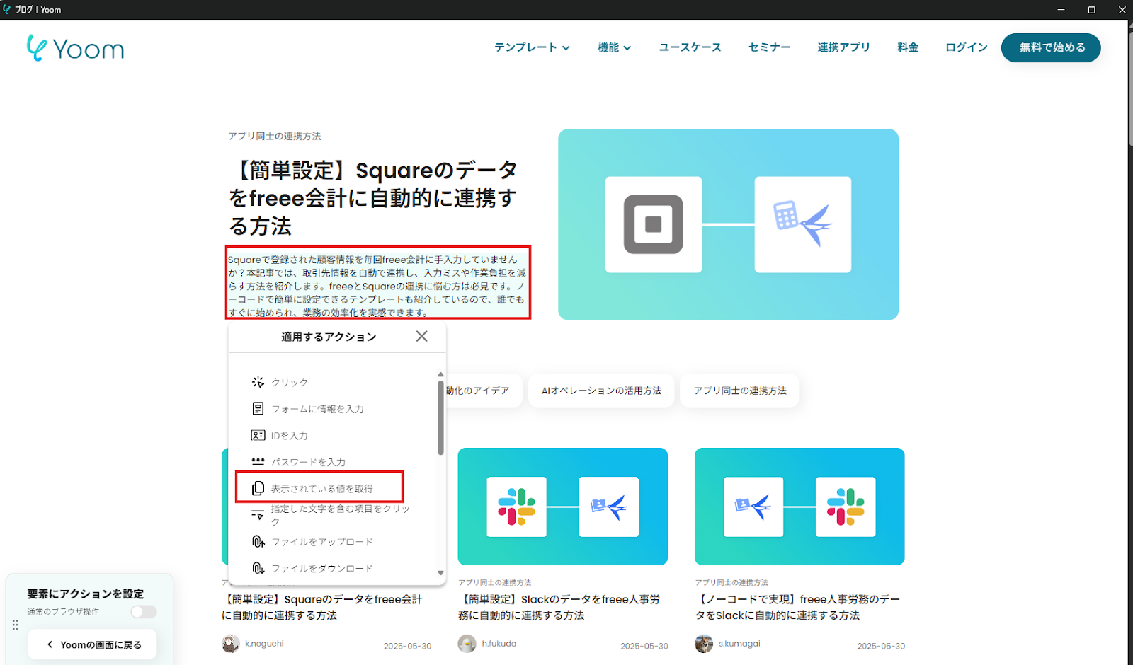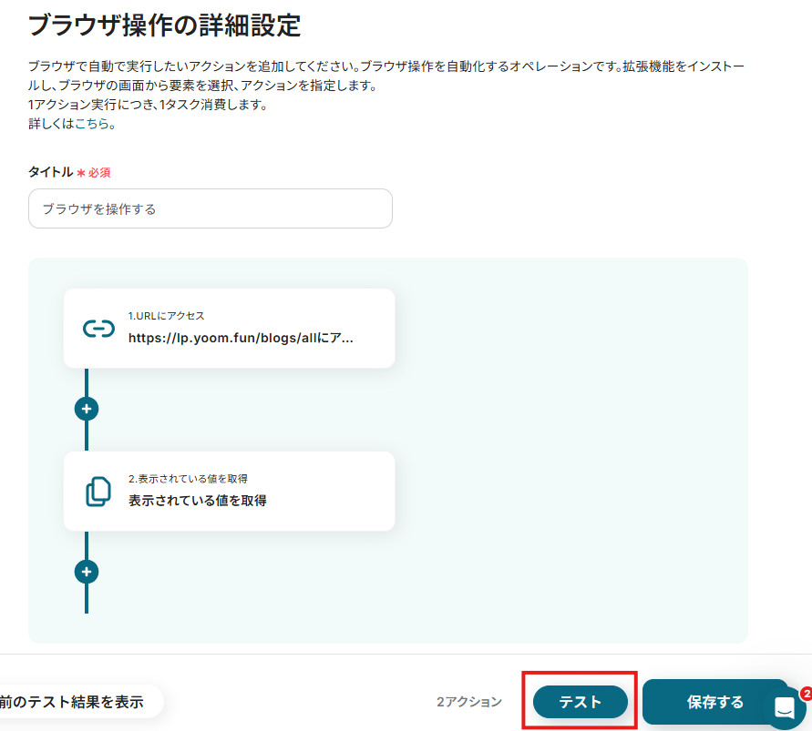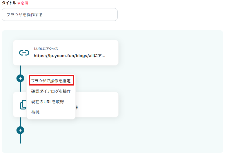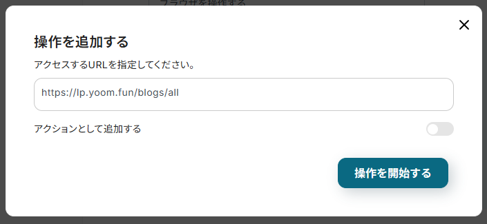 「対象のURL」に入力されたサイトが、ブラウザ操作の対象となります。今回は例として、Yoomのブログサイトを設定しました。