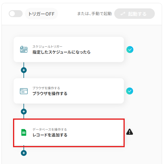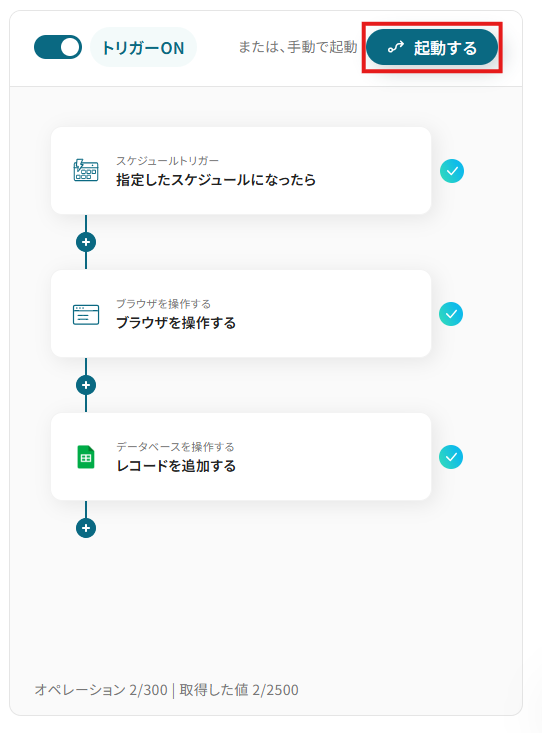 トリガーがONになっているのを確認したら、下記赤枠の「起動する」をクリックしてみましょう。