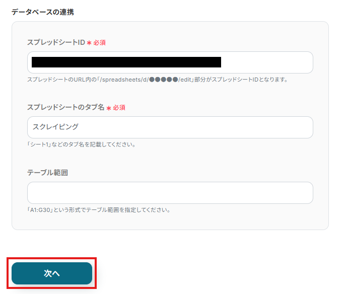 続いて、スクレイピングで取得した情報を、Google スプレッドシートに追加する設定をしていきます。