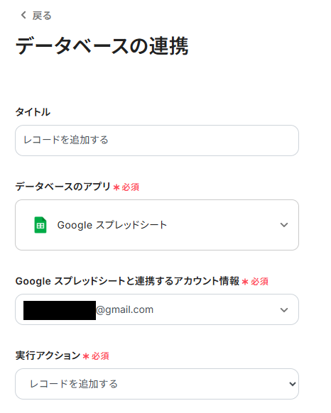 「データベースの連携」画面で、「Googleスプレッドシートと連携するアカウント情報」がご自身のものでお間違いないかご確認ください。