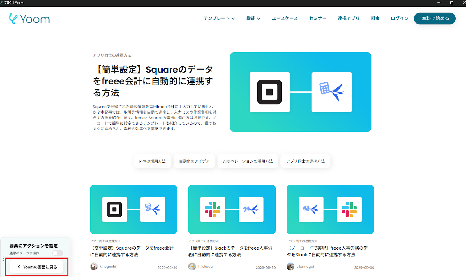 ここまでの手順で、自動化したい一連の操作を再現できたので、左下の「Yoomの画面に戻る」をクリックします。