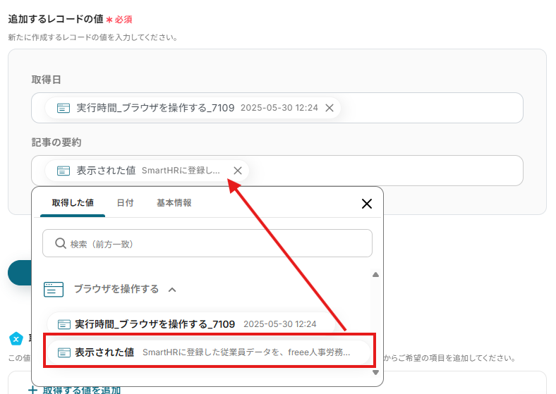 入力欄をクリックすると選択肢が表示されますので、下記のように、「取得日」に「実行時間・・・」、「記事の要約」に「表示された値」を設定しましょう。